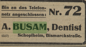 (4) Eintrag im Telefon- und Adressverzeichnis von Schopfheim (ca. 1920er Jahre), der Busam als etablierten Dentist in der Bismarckstraße zeigt. Ein frühes handwerkliches Umfeld